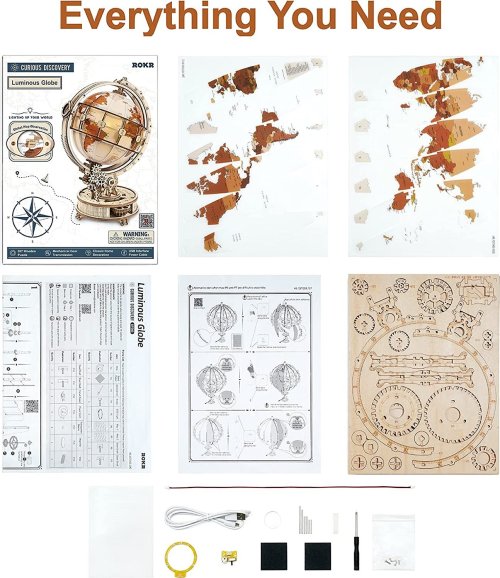 Obtiažnosť: 4 z 5 (podľa rozdelenia Robotime). Orientačná doba na zloženie: 4 - 7,5 hodiny. Popisy miest, oceánov a kontinentov na glóbuse sú v angličtine. Balenie obsahuje: materiál na výrobu modelu, skrutkovač, šmirgľový papier, voskovú tyčinku, USB kábel, detailný obrázkový návod s QR kódom na zobrazenie inštruktážneho videa.