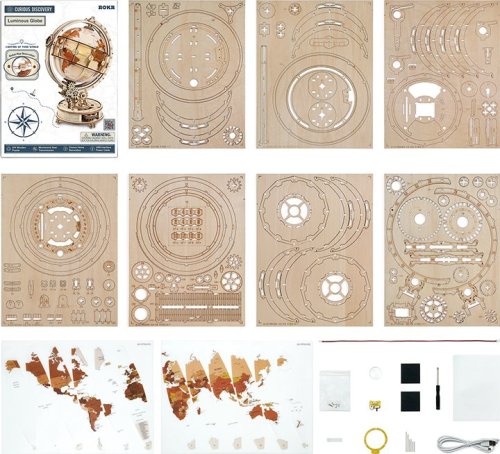 Mechanický prevodový systém, 360° pre navigáciu po celej krajine podľa zemepisnej polohy. LED svetlo s vypínačom napájané USB káblom (súčasťou balenia) - možno využiť ako originálnu nočnú lampičku. Mechanicky ovládaná pevná a otočná konštrukcia zdobená ornamentmi v retro štýle. 25 mm posuvná lupa na vyhľadávanie na mapách a pozorovanie. Na glóbuse sú zobrazené časové pásma, štáty a hlavné mestá (v angličtine). Laserom vyrezávané dieliky z 2 mm lipovej preglejky. Rozvíja technické myslenie, predstavivosť, cit pre detail a jemnú motoriku. Prekrásny darček pre všetkých a na všetky príležitosti.