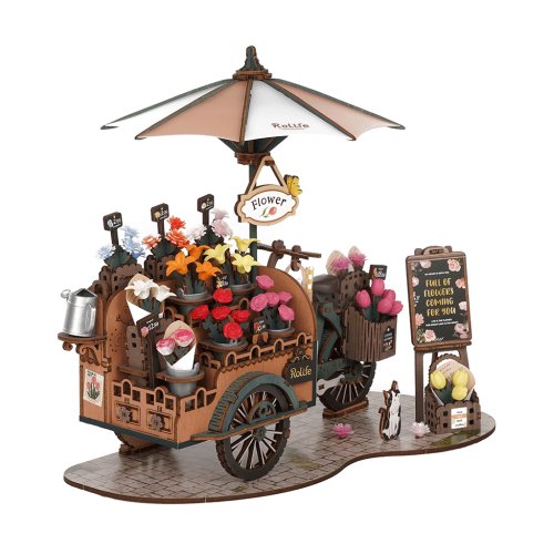 3D model Vás prenesie do minulosti na trhovisko, kde vozík s kvetinami prechádzal mestom a predavač ponúkal okoloidúcim voňajúce čerstvé ruže, ľalie či tulipány Drevený vozík vo vintage štýle pripojený k bicyklu pre predavačov má rustikálne otáčacie kolesá, slnečník chrániaci kvety na zalievanie. Vedľa vozíka je umiestnená tabuľa s ponukou kvetín doplnená košíkom žiarivo žltých tulipánov Roztomilá mačička sleduje, čo sa okolo deje a vône kvetov prilákala aj žltého motýľa Kytica môžete v nádobách meniť a nádoby vyprázdniť Skladanie 3D skladačky podporuje rozvoj jemnej motoriky. . Pozvite svoju rodinu alebo priateľov a užite si zábavné tvorenie bez nutnosti použitia lepidla alebo nástrojov. Všetky diely skladačky sú presne vyrezané a očíslované a ľahko do seba zapadnú, aby výsledok bol stabilný a odolný. Skladačka je dodávaná v nezloženom stave, zabalená v krabici s podrobným návodom na zostavenie.