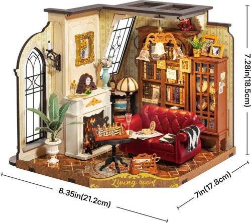 Je plná ladnosti a štýlu, čo sa odráža v jej červenej koženej pohovke, jemnom porcelánovom riade, žiariacom krbe, stojacej lampe, šachovom stolíku a knižnici plnej kníh. Izbu zdobia bohaté drevené tóny, mozaikové dlaždice, klasický nábytok a teplé osvetlenie, ktoré vytvára útulnú, ale zároveň uhladenú atmosféru. Jej priestor, plný obohacujúcich koníčkov a literárnych pokladov, pôsobí zabývane a milovane. Dokonca si uchovala kúsok svojho detstva – červeného hojdacieho koníka uloženého nad najvyššou knižnicou. Obtiažnosť: 3 z 5 (podľa rozdelenia Robotime). Orientačná doba na zloženie: 5 hodín. Pre napájanie LED svetla sú potrebné 2ks 1,5V batérií AAA,LR03,AM4 (nie sú súčasťou balenia),