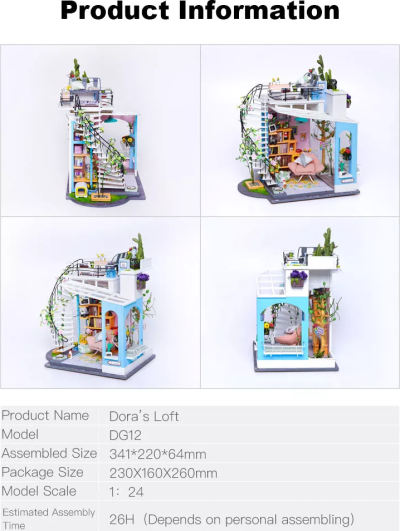 Mierka modelu: 1:20 Pre napájanie LED svetla je treba 2 ks 3V gombíkových batérií CR2032 priemer 20 mm RT. Balenie obsahuje: materiál na výrobu domčeka, lepidlo, farby, štetec, pinzetu, 2 ks batérií, obrázkový návod s doplňujúcimi textami v angličtine. Na zostavenie sú potrebné nožnice (nie sú súčasťou balenia).