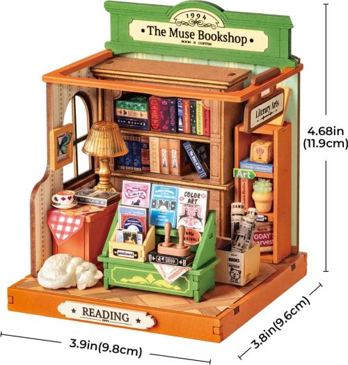 Priateľský kníhkupec vám ponúkne šálku kávy, zatiaľ čo si vyberáte ďalší kúsok do svojej zbierky. Vnútri panuje útulná atmosféra s jemným osvetlením, starožitným nábytkom, umeleckými detailmi a dokonca aj spiacou mačkou v rohu. Každý prvok – obálky kníh, vývesný štít, drevené regály, novinová debnička, stolná lampička aj podlaha s linoleom – prispieva k realistickému vzhľadu, ktorý z tohto modelu robí skutočnú miniatúru života. Obtiažnosť: 1 z 5 (podľa rozdelenia Robotime). Orientačná doba na zloženie: 1,5 hodiny.