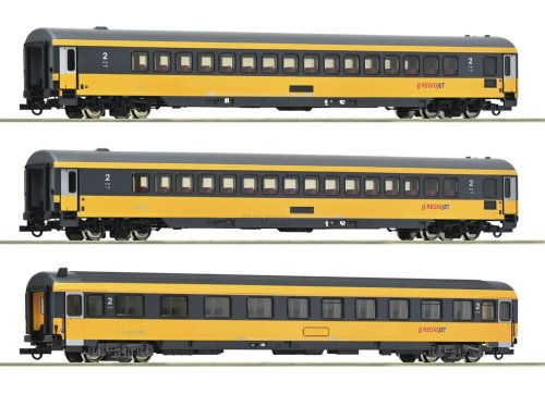 Ide o detailne prepracovaný model skladajúci sa z vozidla Eurofima, triedy ABmz a dvoch osobných vozidiel, triedy Bmpvz/Bpwmz (ex DB Apmz) českej súkromnej dopravnej spoločnosti RegioJet. Regiojet má sídlo v Brne a bol založený v roku 2009. Spočiatku boli prevádzkované iba diaľkové autobusové linky, ale dnes sú okrem niekoľkých lokomotív súčasťou vozového parku aj osobné vozidlá Eurofima a bývalé vozidlá DB Fernverkehr. Diaľkové vlaky jazdia na niekoľkých trasách a sú veľmi obľúbené. Špecifikácia: napájanie DCanalógové ovládanie dĺžka 909 mm spojka - šachta NEM 362 s kinematikou KKsada kolies AC - číslo položky 40196 vnútorné osvetlenie - možno dovybaviť Hlavné vlastnosti: detailne prepracovaný model súprava 3 vagónov s dvoma bývalými vozidlami DB AG špeciálne
