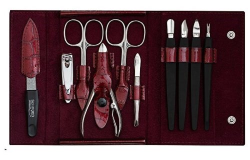 Luxusná manikúrová sada z červenej pravej kože a lesklého niklu má tvar peňaženky s patentovým zapínaním. Zárukou výnimočnej kvality je miesto výroby manikúrových nástrojov, ktoré pochádzajú z nemeckého mesta Solingen. To sa preslávilo výrobou špičkových oceľových výrobkov pre manikúru a pedikúru a jeho ochrannou známkou sa môžu označovať iba tí najlepší výrobcovia.