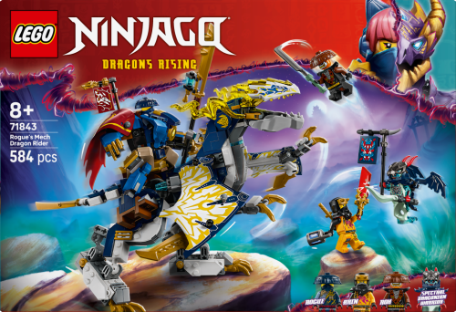 Deti od 8 rokov sa s dobrodružnou stavebnicou Rogue a robotický dračí jazdec pripomenú bitky z 3. radu televízneho seriálu NINJAGO® Dračie povstanie Deti sa môžu s modelmi hrať samostatne alebo pripevniť pohyblivého robota na chrbát vôbec prvého robotického draka NIN Robotický model má pohyblivé ruky a nohy, otváraciu hruď pre umiestnenie minifigúrky dovnútra a meč, drak má pohyblivé krídla, hlavu, čeľusť, nohy a chvost, ak tomu navyše meč Rogue, Arin a dvojica zloduchov Rox a Prízračný dračí bojovník, ktorí majú prápor s tajnou správou