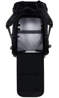 Hlavná komora s objemom 35 litrov disponuje dvoma prístupmi – môžete ju otvoriť zhora bez nutnosti pokladať batoh, alebo ju rozložiť zozadu pre pohodlný prístup k celému obsahu. Vyberateľná prepážka umožňuje oddeliť fotografickú výbavu od ostatných vecí alebo ju úplne odstrániť a vytvoriť jeden veľký priestor. Predné vrecko ponúka vyhradené oddelenie pre laptop alebo tablet do 16" a ďalšie menšie vrecká pre káble, akumulátory a drobné príslušenstvo.