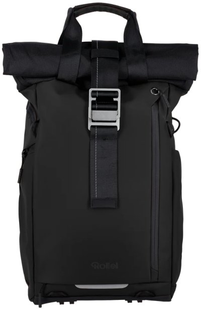 Univerzálny fotobatoh v čiernej farbe s flexibilným úložným priestorom a rolovacím vrchom pre fotografov, cestovateľov a každodenné použitie.