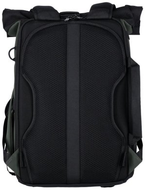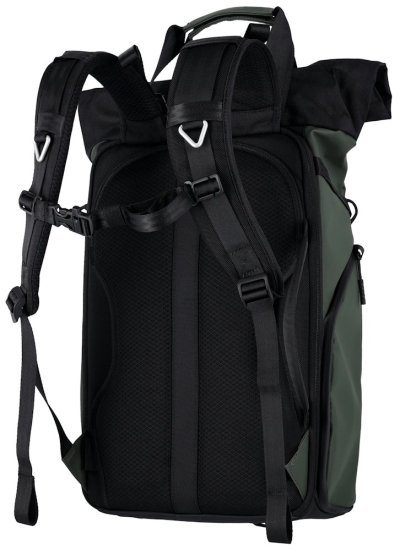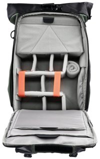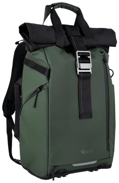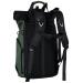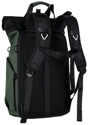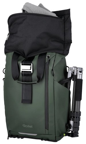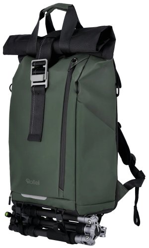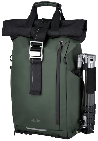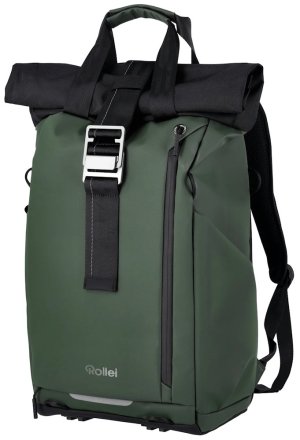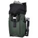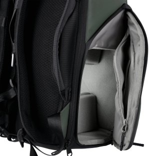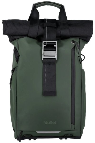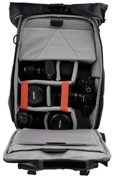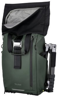 Univerzálny fotobatoh v tmavo zelenej farbe s flexibilným úložným priestorom a rolovacím vrchom pre fotografov, cestovateľov a každodenné použitie.