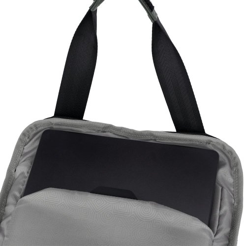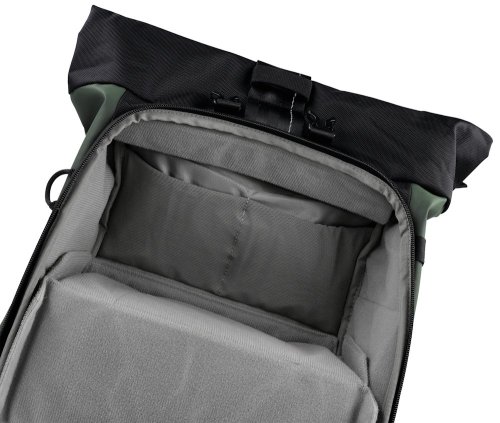 Úložný priestor dopĺňa oddiel na notebook s rozmermi 350 × 260 × 20 mm a samostatné puzdro na tablet 280 × 230 × 20 mm . Rolovacia vrchná časť zaisťuje variabilné prispôsobenie objemu od 12 litrov po 32 litrov . Batoh je vyrobený z ekologického materiálu s obsahom recyklovaného plastu .