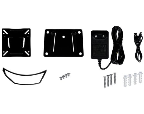 Súčasťou balenia je napájací adaptér, stojan, mini USB kábel a sada pre montáž na stenu.