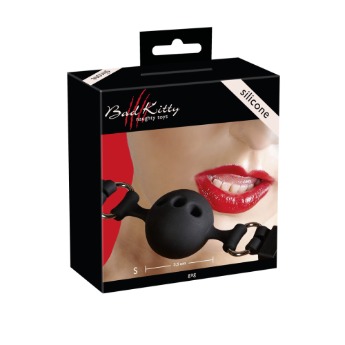 Čierny kolík s vetracími otvormi a nastaviteľným pásikom. Priemer: 3,5 cm. Materiál: Silikón