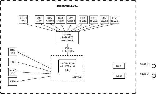 Kompaktný 9portový smerovač Mikrotik RouterBoard RB5009UG+S+IN bol vytvorený na základe spätnej väzby od používateľov, takže ponúka mnoho technologických vychytávok pre naozaj náročné aplikácie. Pýši sa redundantným napájaním, pasívnym chladením a až 2násobným výkonom v porovnaní s produktmi z rovnakej kategórie, o ktorý sa zasluhuje 4jadrový procesor Marvell Armada ARMv8 Amethyst s taktom 1,4 GHz , 1GB pamäť RAM DDR4 a 1GB Flash pamäť s technológiou NAND . Procesor aj prepínací čip Marvell Link Street 88E6393X sú umiestnené na spodnej strane dosky, takže kovový kryt funguje ako pasívny chladič .