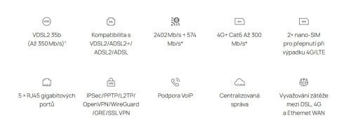Vďaka kombinácii DSL, 4G+ Cat6 a Ethernet WAN portov dokáže router vyvažovať záťaž medzi viacerými pripojeniami pre maximálnu spoľahlivosť. Podpora VDSL2/ADSL a LTE failover s dvoma nano SIM slotmi zaisťuje nepretržitú prevádzku aj pri výpadku hlavnej linky.
