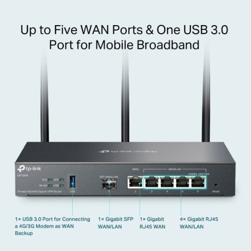 Router je vybavený 1 gigabitovým SFP a 5 gigabitovými RJ45 portami , ktoré spĺňajú rôzne požiadavky na pripojenie k internetu. Funkcia Multi-WAN Load Balancing rozdelí dátové toky podľa podielu šírky pásma každého portu WAN, aby sa zvýšila miera využitia širokopásmového pripojenia. Port USB 3.0 poskytuje vyššiu prenosovú rýchlosť pre mobilné pripojenie.