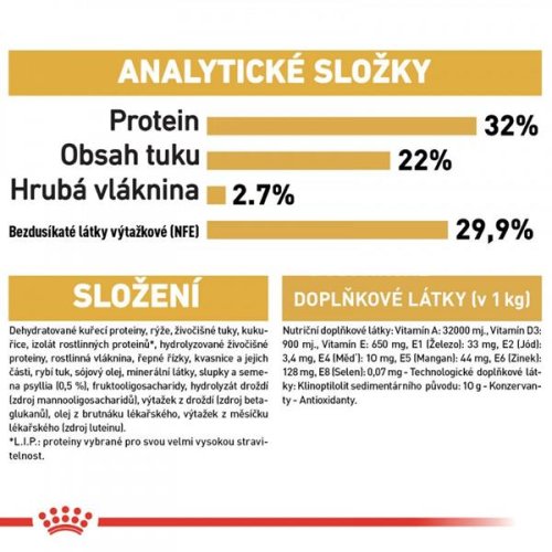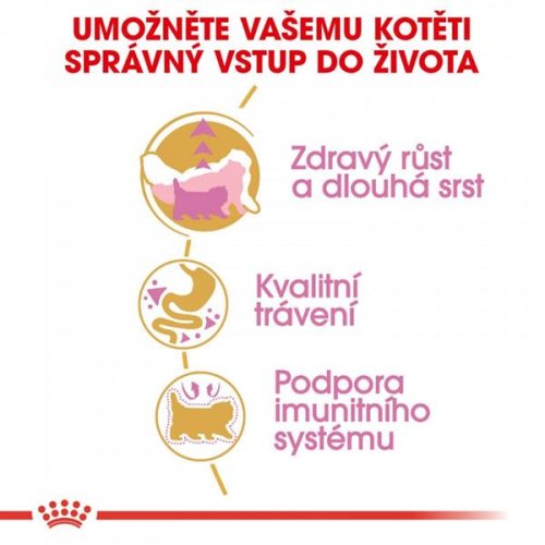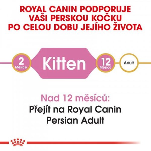Royal Canin Persian Kitten je kompletné superprémiové krmivo pre perzské mačiatka do 12 mesiacov veku. Priamo pre dlhú srsť perzských mačiek je vyvinuté toto krmivo. Obsahuje exkluzívny komplex živín, ktoré pomáhajú podporovať funkciu kožnej „bariéry“ a tým udržujú kožu a srsť zdravú. Špeciálne pre mačiatka sú pridané antioxidanty pre väčšiu obranyschopnosť. Ďalej je zloženie obohatené o Omega 3 mastné kyseliny (EPA a DHA) a Omega 6 mastné kyseliny. Navyše redukuje trichobezoáre, čo znamená, že obmedzuje tvorbu chumáčov chlpov a podporuje motilitu žalúdka a čriev a zabezpečuje vylučovanie chlpu von z tráviaceho traktu. Prebiotiká udržujú vyváženú črevnú mikroflóru a LIP . (vysokostraviteľné bielkoviny) obmedzujú množstvo fermentovaných zvyškov v čreve. Konkrétne pre brachycefalickú čeľusť je granula navrhnutá na ľahšie uchopenie spodnej časti jazyka, vďaka typickému placatému ňufáku perzských mačiek. Zloženie: Dehydratované hydinové mäso, ryža, živočíšne tuky, kukurica, izolát rastlinného proteínu ( LIP . – bielkovina pridávaná pre svoju ľahkú stráviteľnosť), hydrolyzované živočíšne proteíny, rastlinná vláknina, repné rezne, rybí olej, só semená psyllia (0.5%), hydrolyzované kvasnice (zdroj mannooligosacharidov), olej z boráku lekárskeho, výťažok z nechtíka lekárskeho (zdroj luteínu). Doplnkové látky (v 1 kg): vitamín A: 32000 IU, vitamín D3: 900 IU, vitamín E: 650 mg, E1 (železo): 38 mg, E2 (jód): 3,8 mg, E4 (meď): 12 mg, E5 (mangán): 50 mg, E6 (zinok): 150 mg, E8 (selén): 0,08 mg. Technologické doplnkové látky: klinoptilolit sedimentárneho pôvodu: 10 g. Konzervanty. Antioxidanty. Analytické zložky: Bielkoviny 32 %, tuky 22 %, hrubá vláknina 2,8 %, popoloviny 7,9 %. Dávkovanie: