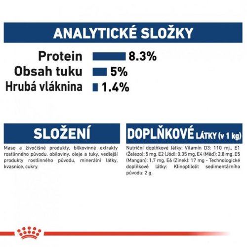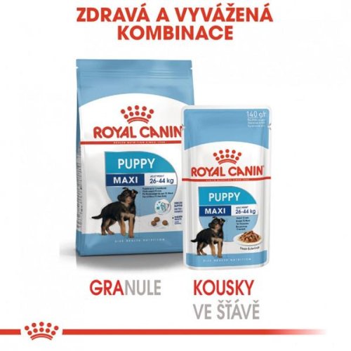 Rast je dôležitou fázou v živote vášho psa: je to obdobie zmien a objavov. Veľké šteňatá potrebujú kompletnú a vyváženú stravu obsahujúcu špecifické živiny, ktoré pri raste podporujú ich zdravie. Zloženie kapsičky pre veľké šteňatá ROYAL CANIN ® Maxi Puppy in Gravy je vytvorené tak, aby uspokojovalo všetky nutričné potreby veľkých šteniat mladších ako 15 mesiacov, ktoré budú v dospelosti vážiť medzi 26 a 44 kg. Aby mohlo podporovať prirodzenú obranyschopnosť vášho šteňaťa počas rastu, vrecko pre veľké šteňatá ROYAL CANIN® Maxi Puppy in Gravy obsahuje exkluzívny komplex antioxidantov, vrátane vitamínu E, ktorý podporuje vyvíjajúci sa imunitný systém vášho šteňaťa. Vysoko stráviteľná bielkovina a prebiotiká vo kapsičke podporujú správnu funkciu tráviaceho systému a zdravú rovnováhu črevnej mikroflóry, ktoré spoločne vedú ku kvalitnej stolici. Rôzne veľkosti a plemená psov majú rôzne energetické nároky. Krmivo ROYAL CANIN ® Maxi Puppy in Gravy obsahuje stredný obsah energie, ktorý uspokojuje stredné energetické nároky šteniat veľkých plemien. Zloženie: Mäso a živočíšne produkty, bielkovinové extrakty rastlinného pôvodu, obilniny, oleje a tuky, vedľajšie produkty rastlinného pôvodu, minerálne látky, kvasnice, cukry. Nutričné doplnkové látky: Vitamín D 3 : 110 oi, E1 (Železo): 5 mg, E2 (Jód): 0,35 mg, E4 (Meď): 2,8 mg, E5 (Mangán): 1,7 mg, E6 (Zinok): 17 mg. Technologické doplnkové látky: Klinoptilolit sedimentárneho pôvodu: 2 g. Analytické zložky: Proteín: 8,3 %, obsah tuku: 5 %, hrubý popol: 2,2 %, hrubá vláknina: 1,4 %, vlhkosť: 79,5 %, vitamín E: 150 mg/kg.