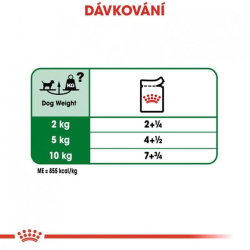 Váš malý pes potrebuje krmivo, ktoré bude podporovať a udržiavať jeho optimálne zdravie počas celého obdobia dospelosti. Zloženie krmiva ROYAL CANIN® Mini Adult in Gravy je vytvorené tak, aby uspokojovalo všetky nutričné potreby malých dospelých psov. Kapsičky ROYAL CANIN® Mini Adult in Gravy sú vhodné pre malých dospelých psov do 12 rokov, ktorí vážia menej ako 10 kg. Kombinácia špecifických živín podporuje zdravie tráviaceho traktu a udržuje rovnováhu črevnej mikroflóry. Starostlivo upravený obsah energie v krmive pomáha malým psom udržať si ideálnu váhu. Je dôležité vyhýbať sa v dospelosti priberaniu, pretože metabolizmus vášho psa je teraz oproti šteňaciemu obdobiu pomalší. Kapsičky pre psov navyše obsahujú aj živiny zlepšujúce stav kože a srsti. Sú obohatené o omega-3 mastné kyseliny EPA a DHA, ktoré udržujú kosti a kĺby zdravé. Zloženie: Mäso a živočíšne produkty, obilniny, oleje a tuky, vedľajšie produkty rastlinného pôvodu, minerálne látky, cukry. Nutričné doplnkové látky: Vitamín D 3 : 150 oi, E1 (Železo): 6,5 mg, E2 (Jód): 0,2 mg, E4 (Meď): 1,7 mg, E5 (Mangán): 2 mg, E6 (Zinok): 20 mg. Technologické doplnkové látky: Klinoptilolit sedimentárneho pôvodu: 2 g. Analytické zložky: Proteín: 7,5 %, obsah tuku: 5,5 %, hrubý popol: 1,6 %, hrubá vláknina: 1,1 %, vlhkosť: 81 %, EPA & DHA: 0,115%.