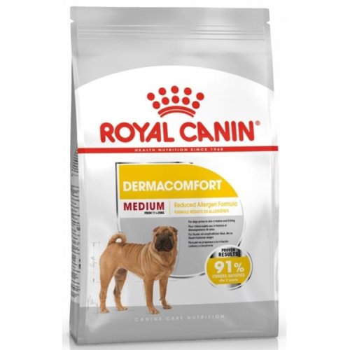 Granuly ROYAL CANIN Dermacomfort Medium, vhodné pre psov s hmotnosťou od 11 do 25 kg, obsahuje starostlivo navrhnuté granule, ktoré dokonale vyhovujú zubom vášho psa. Toto krmivo je obohatené o mastné kyseliny omega 3 a omega 6, ktoré sa vyznačujú protizápalovými vlastnosťami. Mastné kyseliny z rýb a rastlinných olejov pomáhajú upokojiť a chrániť pokožku, ktorá je vďaka tomu menej citlivá na dráždivé látky v prostredí. Mimoriadne chutné krmivo je bohaté na starostlivo vybrané bielkoviny s nízkym obsahom alergénov. Royal Canin vie, aké sú bielkoviny dôležité – preto používa iba tie najkvalitnejšie z nich a ich typ prispôsobuje tak, aby vyhovovali špecifickým potrebám vášho psa. Program výživy Dermacomfort je dostupný ako chrumkavé granule a chutné paštéty v kapsičke. Obe sú nutrične kompletné a dokonale sa dopĺňajú. Prečo nevyskúšať paštétu ako doplnok granúl? Po 2 mesiacoch užívania tohto krmiva si 91% majiteľov psov všimlo zlepšenie. To znamená, že výsledky krmiva ROYAL CANIN Dermacomfort Medium sú preukázaným úspechom. Zloženie: ryža, izolát rastlinných proteínov ( LIP .: proteíny vybrané pre svoju veľmi vysokú stráviteľnosť.), pšenica, živočíšne tuky, kukuričný glutén, lúpaný ovos, kukurica, minerálne látky, hydrolyzované živočíšne proteíny, sójový olej, ľanové semená, frukto-oligosacharidy, olej z boráku lekárskeho, výťažok z nechtíka lekárskeho (zdroj luteínu). Doplnkové látky: Nutričné doplnkové látky: Vitamín A: 29500 oi, Vitamín D3: 800 oi, E1 (Železo): 67 mg, E2 (Jód): 5,5 mg, E4 (Meď): 13 mg, E5 (Mangan ): 67 mg, E6 (Zinok): 150 mg, E8 (Selén): 0,17 mg - Konzervanty - Antioxidanty. Analytické zložky: proteín 24,0 %, obsah tuku 17,0 %, hrubý popol 5,9 %, hrubá vláknina 1,4 %, v 1 kg: Omega 6 mastné kyseliny: 34,2 g vrátane kyseliny gama-linolénovej: 0 ,3 g - Omega 3 mastné kyseliny: 11,3 g vrátane EPA/DHA: 4,1 g. Dávkovanie: