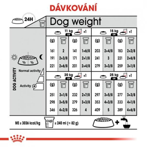 Krmivo ROYAL CANIN Light Weight Care Medium pomáha vášmu psovi udržať ideálnu váhu. Je vhodné pre psov, ktorí vážia medzi 11 a 25 kg. Toto špeciálne zloženie obsahuje skupinu mastných kyselín omega 3, vrátane EPA a DHA, ktoré podporujú kĺby. Diétne granule pre psov sú špeciálne pripravené s nižším obsahom tukov, aby si váš pes udržal ideálnu telesnú hmotnosť. Spoločnosť Royal Canin vie, aké sú bielkoviny dôležité. Zloženie je bohaté na vysoko stráviteľné bielkoviny, ktoré pomáhajú vášmu psovi zachovať svalovú hmotu pri zníženom príjme tukov a kalórií. Optimálna kombinácia rozpustnej a nerozpustnej vlákniny navyše vášho psa zasýti a zaistí aj pravidelný a zdravý priechod čreva pre lepšie trávenie. Program výživy Light Weight Care je dostupný ako chrumkavé granule a chutné paštéty v kapsičke. Obe sú nutrične kompletné a dokonale sa dopĺňajú. Prečo nevyskúšať paštétu ako doplnok granúl? Krmivo ROYAL CANIN Light Weight Care Medium bolo vedecky testované v pet centre Royal Canin a je dokázané, že obsahuje o 21% menej tukov ako bežné krmivo pre dospelé psy. To znamená, že výsledky krmiva sú preukázaným úspechom. Zloženie: dehydratované kuracie proteíny, kukurica, rastlinná vláknina, jačmeň, pšenica, kukuričný glutén, hydrolyzované živočíšne proteíny, živočíšne tuky, ryža, repné rezne, sušená celulóza, kvasnice a ich časti, rybí tuk , hydrolyzát droždia (zdroj mannooligosacharidov), výťažok z nechtíka lekárskeho (zdroj luteínu). Nutričné doplnkové látky: vitamín A: 22500 oi, Vitamín D3: 1000 oi, E1 (Železo): 34 mg, E2 (Jód): 3,5 mg, E4 (Meď): 11 mg, E5 (Mangan): 45 mg, E6 (Zinok): 135 mg, E8 (Selén): 0,06 mg - Konzervanty - Antioxidanty. Dávkovanie: