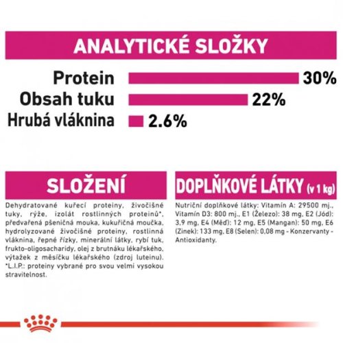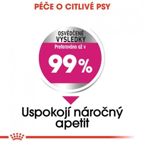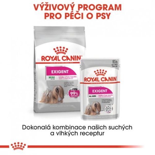 Špeciálne krmivo pre vyberavých psov malých rás (do 10 kg) od Royal Canin s vysokou mierou akceptácie vďaka špeciálnym kroketám. Vhodný aj ako prevencia pred zubným kameňom, s EPA/DHA pre krásnu srsť. Niektorí psy malých rás sú obzvlášť maškrtné, čo komplikuje výber krmiva. Časté zmeny druhu krmiva, uprednostňovanie určitých ingrediencií a alergie na niektoré suroviny spôsobuje, že sa pes stáva vyberavým. Preto potrebujete krmivo, ktoré je psami dobre prijímané a ktoré si psa získa špeciálnym tvarom granúl-kroketkami- a chuťou. Krmivo by malo byť viac než len vyváženým pomerom živín – Royal Canin Mini Exigent podporuje svojim zložením aj zdravú kožu a krásnu srsť. Psy menších rás majú menší chrup ako zástupcovia väčších rás, ich zuby sú tesnejšie pri sebe. Zvyšky krmiva sa preto môžu usadzovať v medzerách medzi zubami, čo podporuje vznik zubného kameňa. Špeciálne kroketky s fosfátmi sodíka pomáhajú chrániť pred zubným kameňom. Zloženie: hydinová bielkovina (sušená), živočíšny tuk, ryža, izolát rastlinnej bielkoviny, pšeničná krupica (prevarená), kukuričná krupička, živočíšna bielkovina (hydrolyzovaná), lignocelulóza, repná rez olej, múčka z kvetov aksamitníka (zdroj luteínu). Doplnkové látky na 1 kg: vitamín A (29.500 IE/kg), vitamín D3 (800 IE/kg), E1 [železo] (38 mg/kg), E2 [jód] (3,9 mg/kg), E4 [ meď] (12 mg/kg), E5 [mangán] (50 mg/kg), E6 [zinok] (133 mg/kg), E8 [selén] (0,08 mg/kg). Dávkovanie: