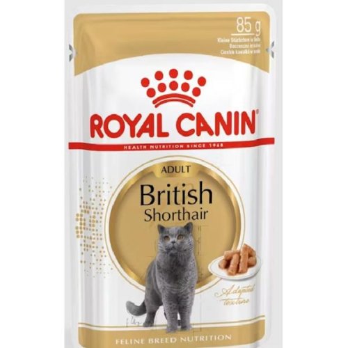 Kapsička Royal Canin British Shorthair Adult bola vytvorená s ohľadom na nutričné potreby britských krátkosrstých mačiek. Vyvážený obsah živín pomôže mačke udržať ideálnu hmotnosť a zároveň dodá jej mohutnému telu dostatok energie na hranie. Kapsička obsahuje špecifické živiny, vrátane radu vitamínov, na udržanie zdravej a dobre vyživovanej srsti a kože. Zloženie: mäso a živočíšne produkty, ryby a výrobky z rýb, obilniny, bielkovinové extrakty rastlinného pôvodu, minerálne látky, vedľajšie produkty rastlinného pôvodu, oleje a tuky, kvasnice. Analytické zložky: proteín 9,1 %, obsah tuku 3,2 %, hrubý popol 1,3 %, hrubá vláknina 0,7 %, vlhkosť 81 %. Nutričné doplnkové látky na 1 kg: vitamín D 3 40 MJ, železo (3b103) 8 mg, jód (3b202) 0,3 mg, meď (3b405) 2,4 mg, mangán (3b502, 3b503, 3b504) 2,6b, 6 3b606) 26 mg. Kŕmny návod: