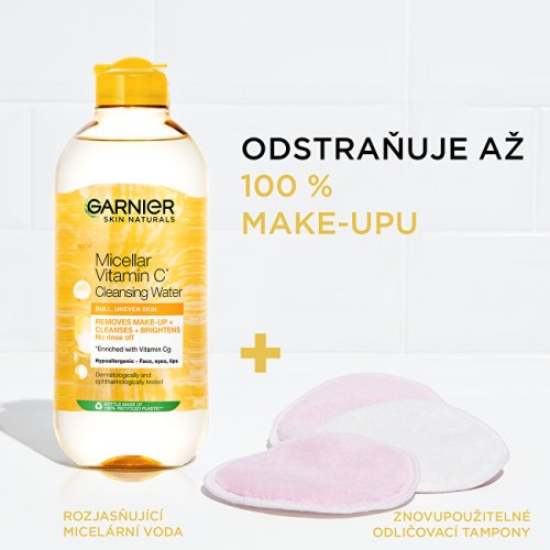 Micelárna voda s vitamínom C predstavuje veľmi jednoduchý spôsob odlíčenia, odstránenia nečistôt, rozjasnenia a zjednotenia pleti jedným ťahom bez oplachovania. Obohatená o rozjasňujúci vitamín C známy pre svoje povzbudzujúce účinky na mdlej a nezjednotenej pleti. Obsahuje micely, ktoré pritiahnu nečistoty ako magnet a bez trenia ich odstránia spolu s make-upom.