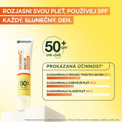 Ľahký denný fluid s vitamínom C a veľmi vysokou ochranou SPF 50+, ktorý rozjasňuje pleť a zároveň ju chráni pred UVB, UVA aj dlhovlnným UVA žiarením. Pomáha predchádzať vzniku tmavých škvŕn a zjednocuje tón pleti. Textúra je neviditeľná na všetkých tónoch pleti, nemastná, nelepivá a vhodná aj pre problematickú pleť.