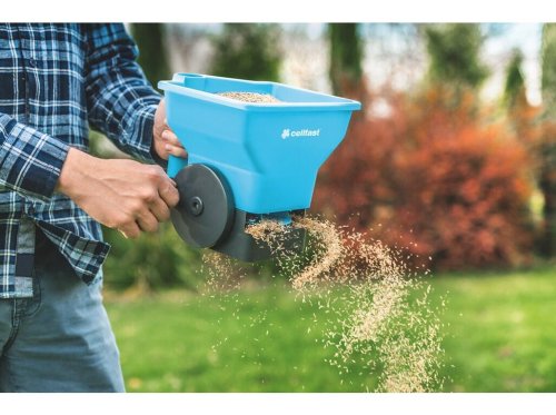 Ručné rozmetadlo. Má otočnú kľučku, vďaka ktorej sa ľahko ovláda a správne dávkuje. Hodí sa na siatie trávy, hnojenie av neposlednom rade aj zime pri posype piesku alebo soli na chodníky. Šírka posypu: 3,6m. Celková kapacita pre rozmetávaný materiál: 3l. Materiál: plast.
