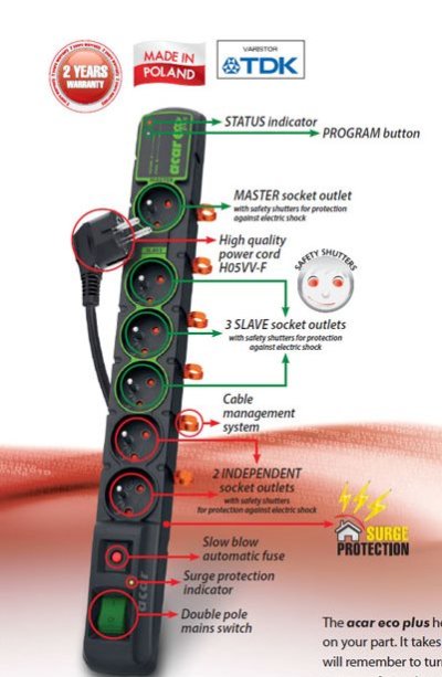 Jednoduchý popis - v obývacej izbe máte televíziu, set-top box, domáce kino a satelit. Napájač funguje tým spôsobom, že púšťa energiu iba do TV, zvyšok zariadenia má napájanie vypnuté, vo chvíli, keď zapnete TV, napájač automaticky pustí energiu aj do zvyšných zariadení. Tým ušetríte za energiu v tzv. pohotovostnom režime.
