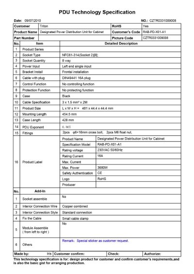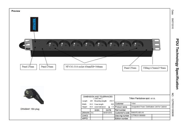 19" rozvodný panel Triton je vybavený 8 zásuvkami podľa ČSN a 2 metrovým káblom s univerzálnou zástrčkou. Kábel je v čiernom farebnom prevedení a znesie max. záťaž 16 A.
