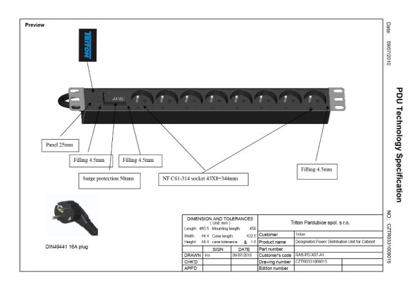 19" rozvodný panel Triton je vybavený 8 zásuvkami podľa ČSN, 2metrovým káblom s univerzálnou zástrčkou a varistorovou bleskoistkou. Kábel je v čiernom farebnom prevedení a znesie max. záťaž 16 A.