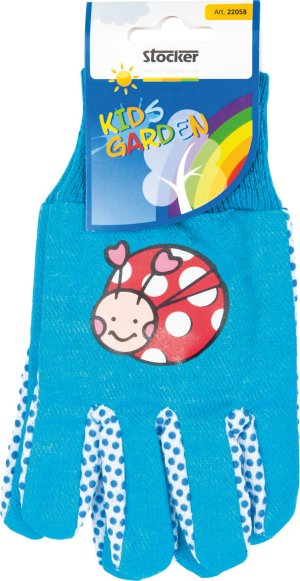 Detské bavlnené pracovné rukavice, dlaňová strana a prsty s terčíkmi z PVC. Farba modrá s obrázkom.