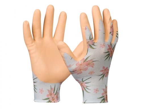 Pracovné rukavice s potlačou oleandrov. Na ich výrobu bolo použitých recyklovaných PET fliaš. Vyrobené z pohodlného, pružného a priedušného úpletu z polyesterových nití opatrené špeciálnym nitrilovým penovým povlakom. Účinne odpudzujú olej a vodu. Veľkosť: 7. Farba: oranžová.