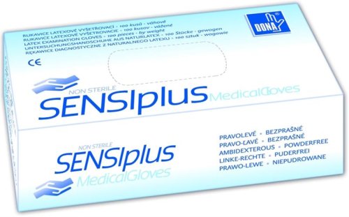 Vyšetrovacie rukavice DONA SENSI PLUS - nesterilná, bezprašná. Táto rukavica je navrhnutá pre pohodlné a bezpečné nosenie. Veľmi nízky obsah proteínov a antigénov v tejto rukavici dovoľuje pohodlné a bezpečné používanie rukavice. Alergické reakcie sú minimalizované vďaka zvláštnemu procesu máčania a vylučovania počas ktorého sa odstraňuje (extrahuje) maximum dráždivých látok z rukavice. Táto rukavica je vyrobená z prírodného latexu, ktorý môže spôsobovať alergické reakcie aj napriek maximálnej redukcii obsahu proteínov na veľmi nízku úroveň. Bezpečné použitie citlivými jedincami nebolo stanovené.