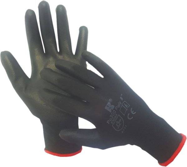 Rukavice pletené, nylonové, bezšvíkové s pružným nápletom, s vrstvou polyuretánu v dlani a na prstoch.