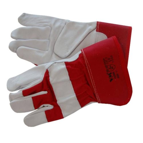pracovné rukavice kombinované VM 1020 R dlaň z veľmi silnej a pevnej hovädzinovej usne v bielej farbe chrbát z bavlnenej červenej tkaniny tuhá pogumovaná manžeta bez podšívky použitie: proti mechanickým rizikám …