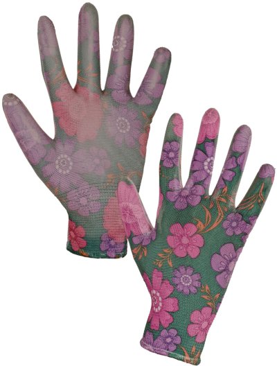 Pletené bezšvové rukavice s potlačou, dlane a prsty povrsteny polyuretánom, pružná manžeta. Balené s blistrom. Vhodné na záhradu, hobby, poľnohospodárstvo a ľahké montáže.