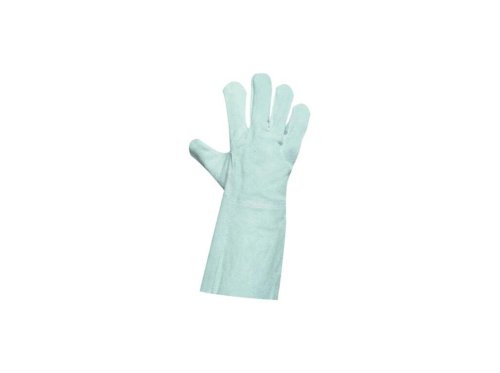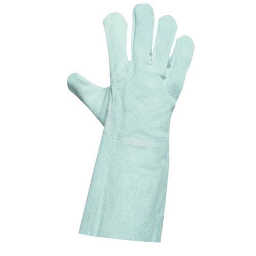 Rukavice pre zváračov, bez podšívky s pevnou predĺženou manžetou šírky 15 cm, vyrobené zo šedej hovädzinovej štiepenky.