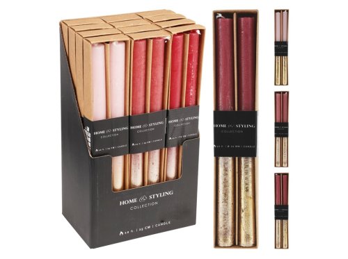 Rustikálne sviečky v sade po dvoch kusoch potešia každého milovníka jedinečných dekorácií. Každá sviečka má rozmer 21x250 mm a je ozdobená elegantnou metalickou povrchovou úpravou od polovice sviečky. Sú ideálne do svietnikov, na sviatočný stôl, oslavy či romantické večery. Svojím dizajnom zaujmú na prvý pohľad a pomôžu vytvoriť príjemnú atmosféru v každej miestnosti. Vhodné aj ako vkusný darček. Tovar je dodávaný v mixe. Doručovaný tovar je vyberaný náhodne a nie je možné vybrať konkrétne prevedenie.<BR>