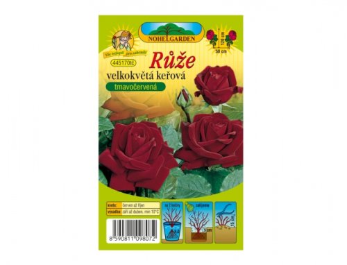 Ruža veľkokvetá kríková tmavo červená. Výsadba von: septembra-apríl. Dĺžka sponu: 50 cm. Doba kvitnutia: jún-október. Výška rastliny: 120 cm.