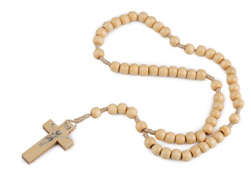 Ruženec z drevených okrúhlych korálikov vás poteší predovšetkým svojim príjemným prírodným dizajnom. Horná časť má rozdelenú na 5 skupín po desiatich korálkoch. Dole je zakončený dreveným krížikom, ktorý má z jednej strany striebornú potlač. Jednotlivé korálky spájajú drhané šnúrky. Ruženec vyniká svojou ľahkou hmotnosťou. Je ideálny pre osobné modlitby a meditácie, poskytuje pokoj a sústredenie na duchovnej ceste. Môžete ho používať počas tradičných modlitebných rituálov alebo ako symbol viery, ktorý môžete mať stále pri sebe. Je vhodný ako na každodenné použitie, tak aj ako dekoratívny prvok vo vašom interiéri. Nejedná sa o náhrdelník.