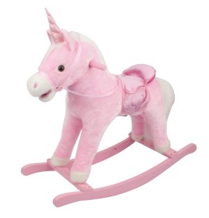 Ružový hojdací jednorožec, ktorý vydáva zvuk pri stlačení jedného alebo druhého ušká. Jednorožec rehtá a kluše. Je vyrobený z kvalitnej a hebkej plyšu. Nosnosť 30 kg.