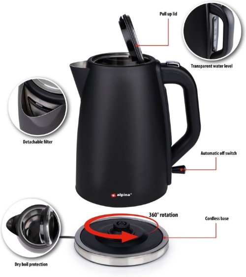 Kanvica Alpina má objem minimálne 1,7 litra. To znamená, že pomocou jednej kanvice uvaríte veľké množstvo vody vo veľmi krátkom čase. Vďaka priehľadnému ukazovateľu hladiny vody presne vidíte, koľko vody je v kanvici a zmeriate si potrebné množstvo.