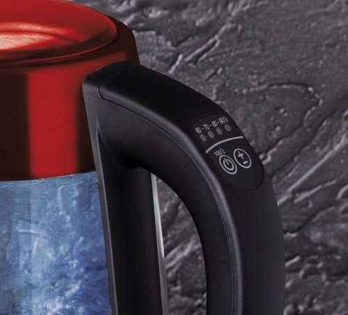 Všetko je navyše doladené modrým LED podsvietením, ktoré je veľmi atraktívnym prvkom tejto kanvice. Čierna plastová rukoväť má nespornú výhodu v tom, že nikdy nepáli.
