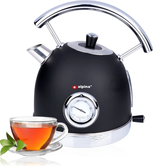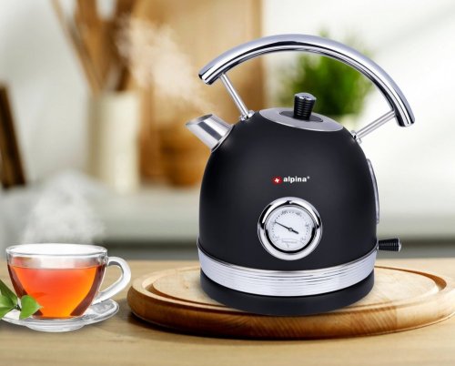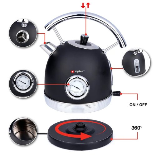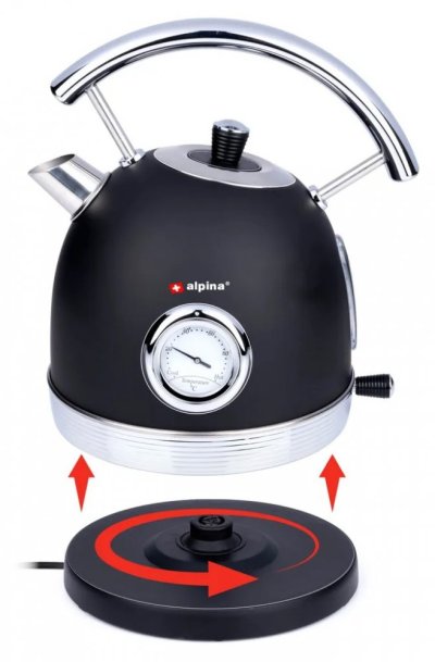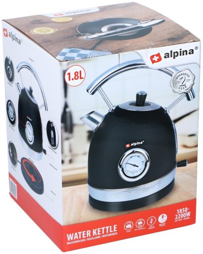 Hľadáte retro rýchlovarnú kanvicu, ktorá behom chvíľky dostane vodu na perfektnú teplotu? Potom je táto kanvica alpina retro čierna to pravé pre vás. Tento dávkovač horúcej vody má kapacitu 1,8 litra, je vybavený vstavaným termostatom, priehľadným ukazovateľom hladiny vody, ochranou proti vyvareniu a oceľovou rukoväťou, vďaka ktorej je nalievanie vody ľahké a bezpečné.
