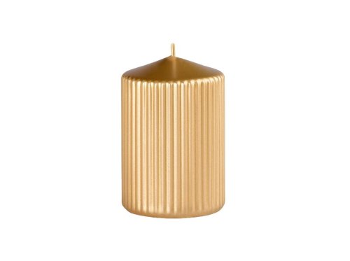 Táto ryhovaná sviečka v tvare valca v metalickej zlatej farbe je elegantným doplnkom pre každý stôl. Jej rozmery sú 65x100mm.