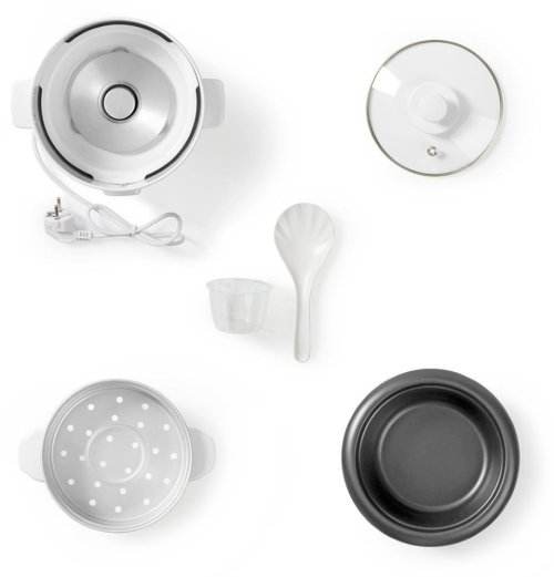 Ryžovar s nepriľnavým vnútorným hrncom z hliníkovej zliatiny s objemom 0,6 litra vám umožní servírovať dokonalú, nadýchanú ryžu. Stačí zmerať požadované množstvo ryže priloženou odmerkou, vložiť do nádoby a pridať správne množstvo vody vyznačenej na vnútornej stene nádoby. Po uvarení sa nádoba automaticky prepne do nastavenia pre udržovanie teploty, vďaka ktorému bude mať ryža v čase podávania jedla tú správnu teplotu. K dispozícii je tiež naparovacia vložka na varenie zeleniny zdravým spôsobom, ktorý zachová farbu, sviežosť a vitamíny.