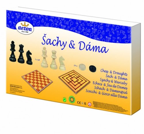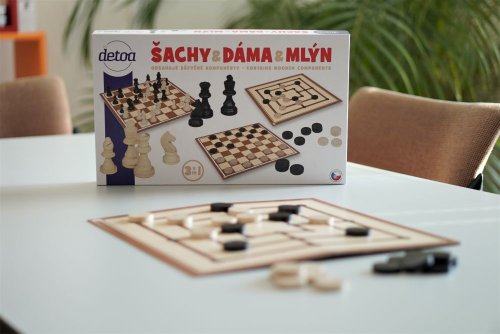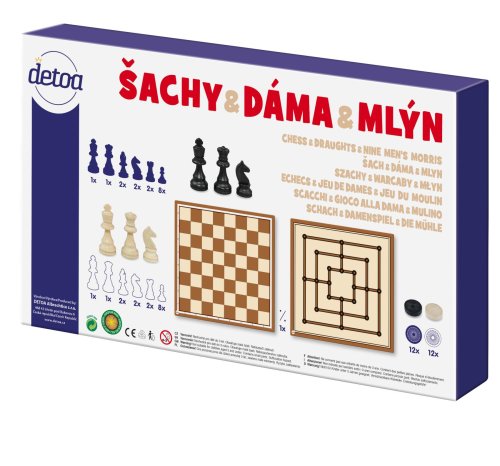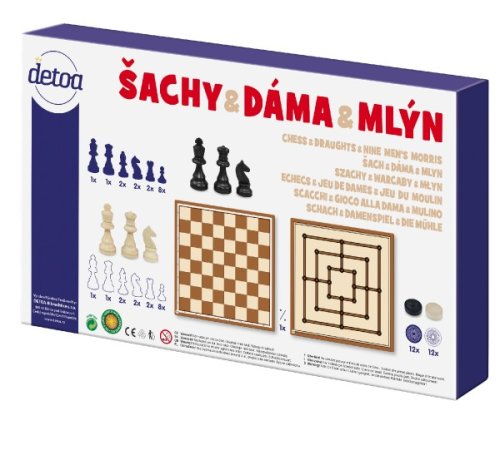 Set obsahuje tri obľúbené doskové hry: šach, dáma, mlyn. Šachové figúrky (rozmer kráľa je 30x74 mm) a dámové kamene (Ø 30 mm) sú drevené a obojstranný herný plán s rozmermi 330x330 mm je z tvrdého kartónu.
