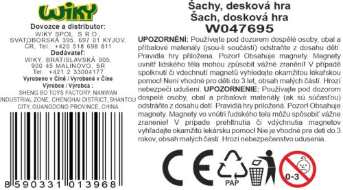 Šach dosková hra. Rozmery krabičky 20x3x10 cm. Magnetické figúrky a doska