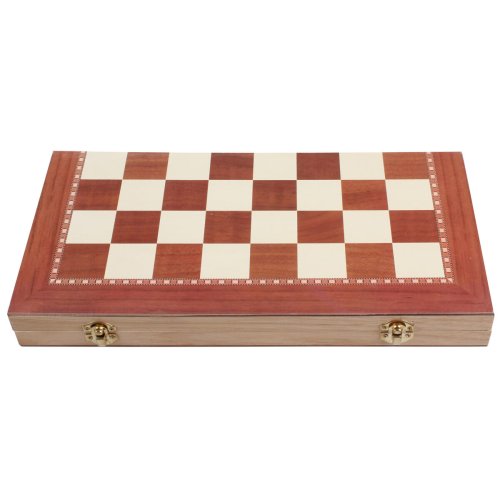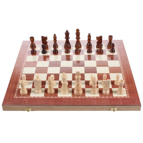 Nielen milovníkov kráľovskej hry poteší drevený rozkladací box v klasickom elegantnom prevedení, ktorý obsahuje 16 tmavých a 16 svetlých drevených šachových figúrok, 15 čiernych a 15 bielych drevených hracích kameňov a dve malé hracie kocky. Najmenšia šachová figúrka má výšku 3,2 cm, najväčšia 7,7 cm, priemer hracích kameňov pre dámu je 2,7 cm. Po rozložení dreveného boxu vznikne hracie pole s rozmermi 39 x 39 cm určené pre šach alebo dámu. Pokiaľ rozložený box otočíte, ponúkne sa vám vo vnútri hracie pole pre hru vrhcáby. Či už sa rozhodnete pre akúkoľvek hru, s týmto praktickým setom sa určite nudiť nebudete. Parametre: Rozmer zloženého boxu: 39 x 19 x 4 cm Váha boxu vrátane šachových figúrok a hracích kameňov: 800 g Rozmer hracieho poľa po rozložení: 39 x 39 cm Materiál: bukové drevo a plastová fólia Obsah balenia: -16 tmavých a 16 svetlých šachových figúrok -15 čiernych a 15 bielych hracích kameňov na dámu alebo vrhcáby -2 x hracia kocka